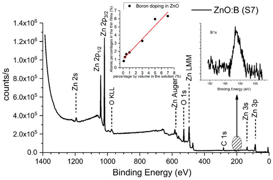 A representative XPS survey spectrum of the boron-doped ZnO thin films. The inset shows (left) the actual dopings obtained from the XPS and the nominal values and (right) a magnification of the spectrum with the B 1 s peak.