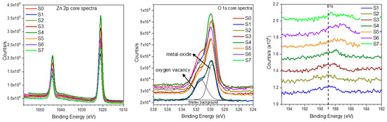 The O 1s high-resolution spectra for all the thin films show one main peak, and the shoulder appears with lower intensities at higher energies. We show one representative least square fit made to the O 1s spectrum for the S7 sample in Figure 4. The peak that appeared on the lower energy side is commonly attributed to the oxygen metal-oxide bond in the stoichiometric ZnO lattice, while the peak on the higher energy side is due to the metal ions in an oxygen-deficient environment (frequently termed oxygen vacancy (V)) in the lattice [68]. The ratio of oxygen vacancy to the metal-oxide bond (Ov/OM-O) decreased in the boron-doped ZnO thin films, as indicated in Table 3, compared with the pure ZnO. Apparently, the boron helps to structure the ZnO towards a more stoichiometric phase. The high-resolution XPS spectra in Figure 4 show a shift of the B 1s intensity towards lower binding energy upon increasing the B doping level, indicating that boron has the tendency to form a metallic phase in ZnO.