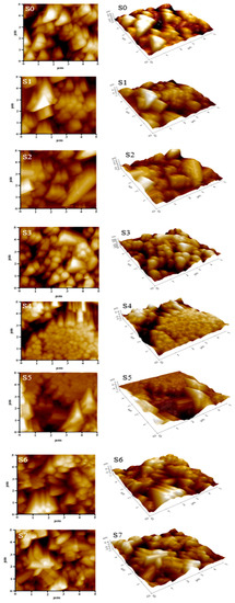 Figure 7 (right side of each sample) shows three-dimensional AFM images of the pristine ZnO thin film and the different boron-doped ZnO samples. The values of the root mean square roughness (Rq), the average roughness (Ra), and the 10-point average roughness (Rz) of ZnO are given in Table 4. It can be seen that the labeled S5 film shows average surface roughness (Ra).