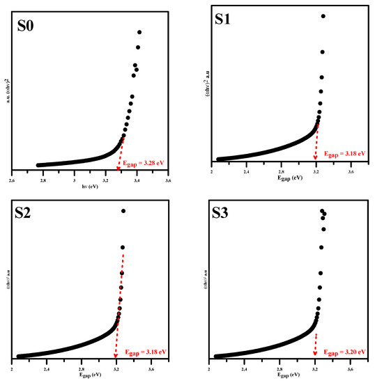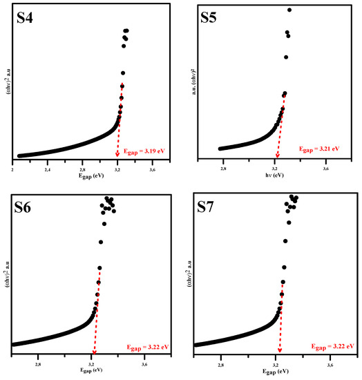 The optical band gap energies of the ZnO and boron doped ZnO thin films were calculated as 3.28, 3.18, 3.18, 3.20, 3.19, 3.21, 3.22 and 3.22 eV, respectively. Ahmad et al. also calculated the optical band gap energies and found that the Eg of pure ZnO decreases from 3.37 eV to 3.17 eV upon B doping [69]. This shows that increasing the doping concentration results in decreased band gap values in the structures (Figure 8).