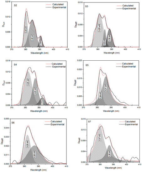 In order to make more detailed analysis of the reflectance spectra of the films, the process of deconvolution was performed in the wavelength range of 410-370 nm. The differential reflectance dR/dλ versus λ is also shown in Figure 9. The corresponding Eg values can be estimated for these films by using the average of the maximum values of these plots. The calculated values are 3.22, 3.21, 3.21, 3.22, 3.20, 3.22, 3.22 and 3.25 eV, respectively.
