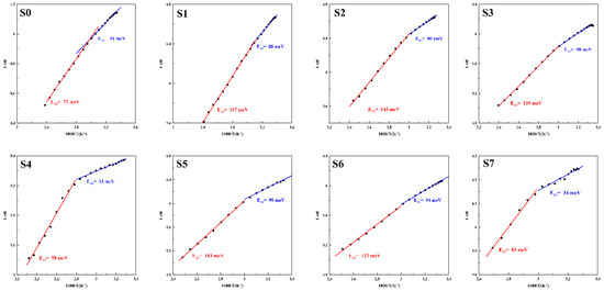 where R0 and R’0,i are constants, Eg is the thermal band gap energy, Ei is the impurity level ionization energy, k is the Boltzmann constant, and T is the absolute temperature in Kelvin. In the low-temperature region, the total conductivity of the semiconductor samples is dominated by charge carriers generated by the ionization (extrinsic conductivity) of the impurity levels and hence the second term dominates at room temperature. Particularly at high temperatures, the electronic transitions from band to band are responsible for the temperature dependence of the conductivity. Under these conditions, charge carriers obtain sufficient thermal energy to make an inter-band transition [71]. According to the information given above, the two terms appearing in Equation (10) may be assumed independently in the corresponding temperature intervals. Therefore, in the graph of Ln(R) versus 1000/T (Figure 10), a series of linear trends appear, showing the forbidden band gap and a set of impurity levels (band gap states) in the forbidden band gap. However, for a semiconductor with a wide forbidden band gap such as ZnO, the conductivity is dominated by charge carriers generated by ionization of the impurity levels in the studied temperature range.