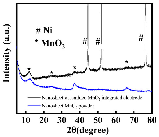 To examine the crystallinity and crystal phases, the as-prepared samples were tested by powder X-ray diffraction pattern, (XRD) and the results are shown in Figure 2. It can be observed that the main three strong peaks at around 44.6°, 51.9°, and 76.6° correspond to metal nickel substrate (JCPDS No. 70-0989). Except for diffraction peaks from the nickel substrates, all other diffraction peaks were in good accordance with the Birnessite-type δ-MnO2 (JCPDS No. 80-1098) [34,35]. The broad and weak features indicate the typical characteristic of nanocrystalline for MnO2. The MnO2 powder sample with nanosheet morphology was prepared by a low-temperature redox method for comparison. All of the characteristic signals of the sample match are in good accordance with the Birnessite-type MnO2 phase. Figure S2 shows that, in the XRD pattern of commercial MnO2 powder, all diffraction peaks can be assigned to MnO2 with tetragonal symmetry structure (JCPDS No. 24-0735).