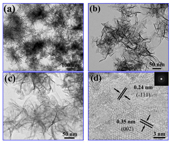 (a–c) Typical TEM images of the nanosheet MnO2; (d) HRTEM images of the nanosheet MnO2. The inset of d shows that these nanosheets are polycrystalline.