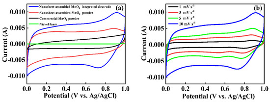 (a) CV curves of MnO2-based electrode materials (nanosheet-assembled MnO2-integrated electrode, nanosheet-assembled MnO2 powder, and commercial MnO2 powder) and nickel foam at a scan rate of 10 mV s−1; (b) the CV curves of nanosheet-assembled MnO2-integrated electrode at different voltage scan rates, from 1 to 10 mV s−1.
