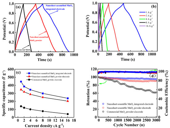 (a) GCD curves of MnO2-based electrode materials (nanosheet-assembled MnO2-integrated electrode, nanosheet-assembled MnO2 powder, and commercial MnO2 powder) at a scan rate of 1 A g−1; (b) the specific capacitance of nanosheet-assembled integrated electrode at different charge/discharge current densities (1 A g−1, 2 A g−1, 4 A g−1, 8 A g−1, and 16 A g−1); (c) comparative rate performance of MnO2-based electrode materials (1 A g−1, 2 A g−1, 4 A g−1, 8 A g−1, and 16 A g−1); and (d) cycle performance of MnO2-based electrode materials at a current density of 1 A g−1 for 3000 cycles (left: retention; right: Coulombic efficiency).