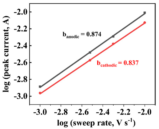where i presents the current at a given potential, ν stands for the scan rate, and a and b are adjustable parameters. The parameter b (0.5–1.0) can be determined from the slope of the linear plot log i versus log ν. It can be used to provide kinetic information about the electrochemical reactions in the supercapacitor. Overall, when b equals 0.5, the charge storage process belongs to the diffusion-controlled behavior. While b is 1.0, it is an ideal capacitive-controlled process. As shown in Figure 7, the b values of anodic and cathodic are fitted to be 0.874 and 0.837, respectively, which indicates that the present electrochemical response is mainly controlled by pseudocapacitive behavior.