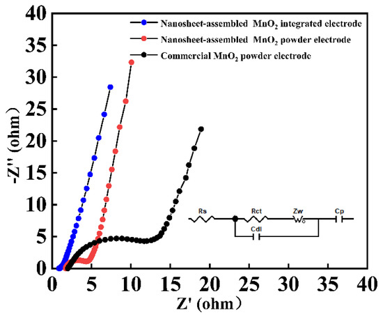 To gain further insight into the cause behind the differences in capacitance among the three electrodes from the point of view of the ion transport kinetic, the electrochemical impedance spectrum measurements were performed in the frequency range from 0.1 Hz to 100 kHz; the corresponding Nyquist plots are shown in Figure 8. It is clearly observed that the tested impedance spectrums of MnO2-based electrode exhibit a quasi-semicircle at high frequency and a straight line at low frequency. Based on the equivalent circuit model, such impedance data can be fitted as shown in the inset of Figure 8. At the high-frequency region, the intersection point of the semicircle on the X-axis represents the equivalent series resistance (Rs), including electrolyte resistance, intrinsic resistance of MnO2-based materials, and contact resistance at the electrode/collector interface [24,38,47,48,49,50]. The nanosheet-assembled MnO2-integrated electrode shows the lower Rs value of ~0.87 ohms when compared with other MnO2-based powder electrodes. This implies that an excellent conductivity and good interfacial contact between MnO2 nanosheets and metal nickel. Meanwhile, the nanosheet-assemble MnO2-integrated electrode has a lower charge transfer resistance (Rct) evaluated through the diameter of the semicircle located at the high-to-medium frequency. This suggests that the nanoarchitecture MnO2 can reduce the charge-transfer resistance and can provide a short path for ion diffusion. Meanwhile, the lower Rs and Rct values are also attributed to the binder-free nature of the electrode and a very tight connection between the nanosheets MnO2 film and metal nickel. Therefore, the EIS results clearly demonstrate that the integrated electrode exhibits favorable charge/discharge kinetics and good electrical conductivity, thusly showing excellent electrochemical performance.