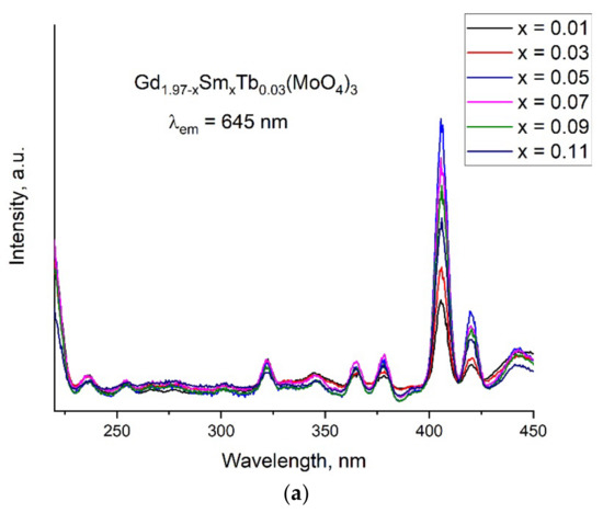 In Figure 4a, the excitation spectra are shown for the samples of Gd1.97−ySmyTb0.03(MoO4)3 monitored by the 645 nm fluorescence emission (electric dipole transition 4G5/2 → 6H9/2), which is one of the characteristic bands of an Sm3+ ion. Very weak broad bands between 225 and 300 nm were considered because bands appeared by the charge transfer due to the O2--Sm3+ interactions [31,32]. A series of excitation bands presented between 225 and 450 nm corresponded with the typical f–f transition of Sm3+ ions centered at 332, 345, 361, 376, 391, 406, 418 and 440 nm. The strongest intensity band was the one at 406 nm, transition 4H5/2 → 4K11/2 [33]. This band intensity increased when the Sm content increased up to x = 0.05 and then it decreased with the further increase in Sm content (x = 0.07, 0.09 and 0.11). It is known that a host matrix containing a transition metal (such as VO43−, NbO43−,WO42− or MoO42−) has an advantage over the host matrices absorbing in the UV region due to the charge transfer between the transition metal ion (electron deficient) and the oxygen ion (electron rich). Thus, the energy transfer between the transition metal atom and oxygen is considered to be an important factor to increase the luminescent properties of inorganic phosphors [12].