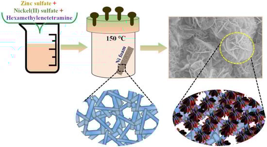 The three-dimensional flower-like NiZn2O4 was grown over nickel foam (NiZn2O4@3D-NF) via a simple and cost-effective hydrothermal process, using zinc sulfate (ZnSO4·7H2O), nickel sulfate (NiSO4·6H2O), and hexamethylenetetramine (C6H12N4) as the starting precursors. For this process, initially, a piece of nickel foam (Figure S1, in Supplementary Materials) with a size of 1 × 3 cm, was washed with 1-M hydrochloric acid solution, ethanol, and DI water, followed by ultrasonication to remove the oxidized layer present over the surface. Next, 0.2875 g of ZnSO4·7H2O, and 0.2321 g of NiSO4·6H2O, were dissolved in 50 mL of a C6H12N4 aqueous solution, and were further stirred for 15 min at 60 °C. The resulting mixture was transferred to a Teflon-lined stainless autoclave, in which the nickel foam (1 cm × 3 cm) substrate was dipped. After that, the autoclave was carefully sealed and placed in an electric oven at 150 °C for 5 h. After completion of the reaction, the resulting precipitate was washed with water and ethanol, dried at 80 °C for 12 h, and was then stored in a desiccator for further study. The three-dimensional flower-like NiZn2O4 grown over the nickel foam is abbreviated as NiZn2O4@3D-NF (Figure 1). For the comparative study, nickel oxide was also grown over nickel foam under similar experimental conditions, and it is abbreviated as NiO@3D-NF.