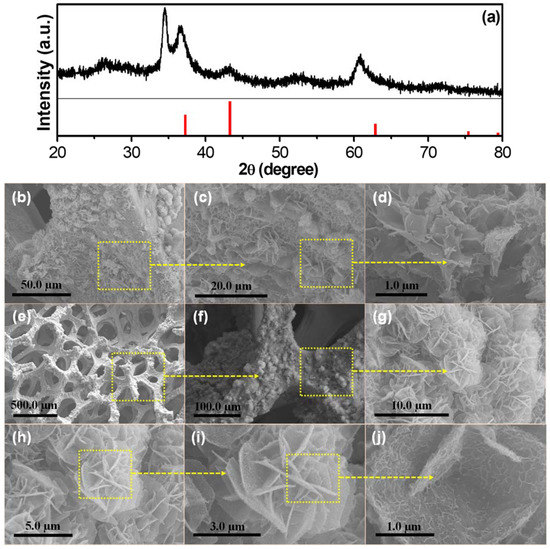 (a) XRD patterns of NiZn2O4@3D-NF, and FE-SEM images of (a–c) nickel oxide, and (d–j) NiZn2O4@3D-NF at different magnifications.