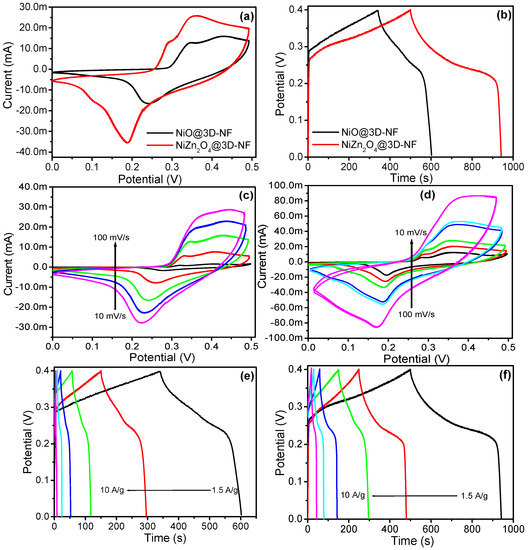 (a) Comparative CV of NiO@3D-NF and NiZn2O4@3D-NF; (b) comparative GCD graph of NiO@3D-NF and NiZn2O4@3D-NF; (c) CV of NiO@3D-NF at different scan rates; (d) CV of NiZn2O4@3D-NF at different scan rates; (e) GCD graph of NiO@3D-NF at different current densities; and (f) GCD graph of NiZn2O4@3D-NF at different current densities.