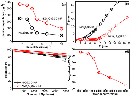 (a) Calculated specific capacitance of NiO@3D-NF and NiZn2O4@3D-NF; (b) Nyquist plot of NiO@3D-NF and NiZn2O4@3D-NF; (c) cycling stability graph of NiO@3D-NF and NiZn2O4@3D-NF; (d) Ragone plot of NiZn2O4@3D-NF.