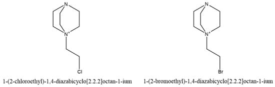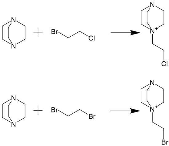 To construct hybrid structures of such kind, organic ligands with special structures have been designed [34]. The ligands should be cationic while having free coordination atoms as binding sites. The cationic ligands in the reaction will allow the formation of ionic compounds with anionic inorganic modules. On the other hand, the free binding sites in the organic ligands would allow the coordination to Cu atoms forming coordination bonds. A common strategy for designing the organic ligands for the construction of the zwitterionic type of hybrid structures is by using the controlled alkylating approach of bidentate N-ligands. In this approach, a bidentate N-ligand is selected and the alkylation is controlled at the stage where only one of the tertiary N atoms would be alkylated and the other N site remains unreacted. 1,4-Diazabicyclo [2.2.2] octane (DABCO) was selected as the bidentate N-ligand and two cationic ligands were prepared. These types of ligands have been selected since they have good coordination ability with copper atoms. They are 1-(2-chloroethyl)-1,4-diazabicyclo [2.2.2]-octan-1-ium) (L1) and 1-(2-bromoethyl)-1,4-diazabicyclo [2.2.2]-octan-1-ium) (L2) (Figure 1). The reaction scheme is shown in Figure 2. 1H NMR spectroscopy of the synthesized ligands L1 and L2 is shown in Figure S1.