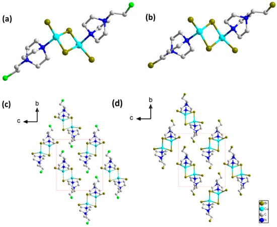 (2) The two structures are molecular compounds with anionic inorganic core and cationic organic ligands. The inorganic modules of these two structures are Cu2Br42− anion, which are coordinated to the cationic organic ligands via Cu-N coordinative bonds.