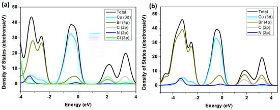 Density functional theory (DFT) calculations were conducted on 1 and 2 using the Cambridge Serial Total Energy Package (CASTEP) in Materials Studio 8.0, as shown in Figure 6a,b, respectively. For both compounds, the conduction band minimum (CBM) is majorly contributed from the C 2p orbitals from the organic ligands while the valence band maximum (VBM) is mainly contributed from Cu 3d and Br 4p orbitals. Since there are halide atoms in the organic ligands, the contribution of halides should also be counted (Cl 3p and Br 4p). Such band structures resemble what has been observed for neutral copper halide hybrid structures with dimer or staircase chain modules [37,38].