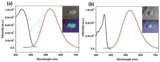 Emission spectra plots (red) and excitation spectra plots of 1 (a) and 2 (b). λex = 320 nm, λem = 525 nm. Inset: sample under natural light and UV light.