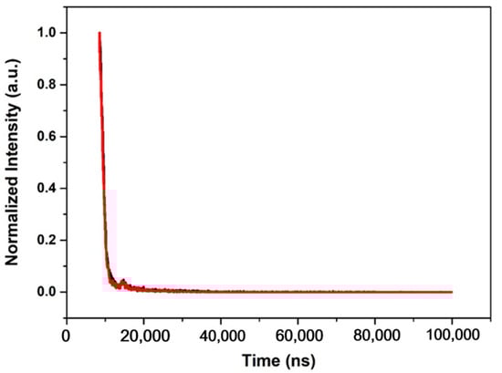 The internal quantum yields (IQYs) were measured on a C9920-03 absolute quantum yield measurement system (Hamamatsu Photonics) at room temperature, and the values are given in Table 2. The IQYs of compound 1 and 2 are 11.5% and 10.6%, respectively, at excitation energy of 320 nm. The weak emission and lower IQYs of these compounds can be explained by the absence of metal-to-ligand charge transfer (MLCT) or halide-to-ligand charge transfer (XLCT) due to the aliphatic ligands in these structures. Their luminescence mechanism can be attributed to a triplet cluster-centered excited state from the strong Cu to Cu interaction. The photoluminescence property of the compounds and the mechanism is similar to that of Cu4I4 cubane tetramer-based hybrid compounds [39]. The luminescent decay curves of these two green emitters at room temperature are shown in Figure 8, and their lifetime values are approximately 10.66 μs and 10.34 μs by monoexponential fitting. The microsecond lifetime values of these two compounds at room temperature suggest that their luminescence is phosphorescent emissions. Table 2 summarizes the major photophysical properties of 1 and 2.