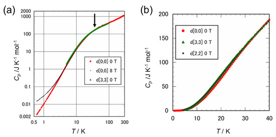 In Figure 2a, we show the temperature dependences of the heat capacity of the d[0,0] and d[3,3] compounds in a logarithmic plot. The red color represents the data of the d[0,0] compound from 0.8 K to 288 K. The low-temperature data below 20 K were obtained by the thermal relaxation technique as was already reported in references [27,28], and the higher temperature data were obtained by an adiabatic calorimeter. The black curve shown in the temperature range below 20 K is the normal state heat capacity obtained by fitting the data with 8 T, which was applied perpendicular to the conducting layer. The low-temperature data have already been reported by several groups [29,30,31,32].