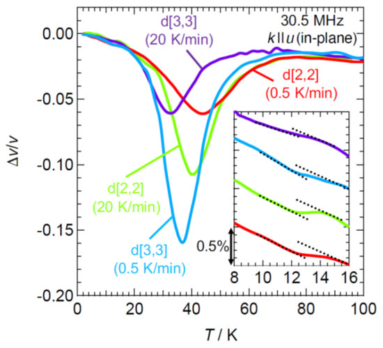 The peculiar softening of the acoustic phonons of the partially deuterated d[2,2] and d[3,3] compounds below about 40 K, similar to the reported softening in κ-(BEDT-TTF)2Cu[N(CN)2]Cl [16] under pressures, was detected by the sound velocity measurement. The datasets shown in Figure 3 were the relative change in the ultrasonic sound velocity Δv/v of the d[2,2] and d[3,3] compounds between 5 K and 100 K obtained for the cases with different cooling rates of 0.5 K min−1 and 20 K min−1. Δv/v showed a peculiar dip structure, indicating a tendency of significant lattice softening in a temperature range between 20 K and 50 K, and the temperatures showing the minima were 34 K for 20 K min−1 and 38 K for 0.5 K min−1 for the d[3,3] compound. Here, we emphasize that the temperature region where the decrease of the sound velocity took place was roughly corresponding to the region where the larger heat capacity appeared.
