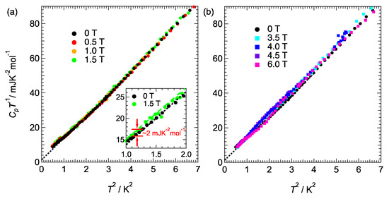 The heat capacity data obtained at higher magnetic fields of 3.5 T, 4.0 T, 4.5 T, and 6 T are shown in Figure 4 b. A curious tendency different from the pair breaking appeared in the temperature dependence of the electronic heat capacity. The CpT−1 vs. T 2 plots of 3.5 T, 4.0 T, and 4.5 T showed small hump-like structures around T = 1.4–1.7 K, and they were suppressed in the higher magnetic field of 6 T. The feature was different from the contribution of simple paramagnetic spins, which should give a Schottky-like heat capacity, since the Schottky anomaly gives the systematic change due to the increase of Zeeman splitting. The γ values in these fields were smaller than those of the data at H = 1.5 T. It is emphasized that the data at H = 6 T gave a much smaller γ value of 0.9 mJ K−2 mol−1, which is a comparable value with that at H = 0 T.