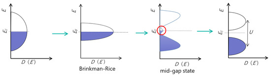 Schematic illustration of the electronic structure expected for the dimer-Mott compounds. Normal band metal on the left side gradually changed to the Mott–Hubbard state with the increase of U/W ratio. The variation from the Brinkman–Rice region to the mid-gap state region may be realized with the increase of partially deuteration.