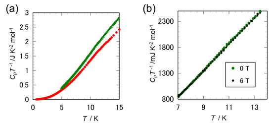 (a) CpT−1 vs. T plot of the heat capacity of the d[0,0] compound (red color) and that of the d[3,3] compound (green color) obtained at 0 T; (b) the extended plot around the superconducting transition of the d[3,3] compound obtained at 0 T and 6 T. The data at magnetic fields of 0 T and 6 T are shown by the green circles and the black circles, respectively. A broad and small hump around the transition seemed to be suppressed by an external magnetic field.