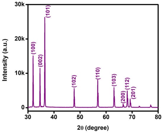 To understand the crystal structure of the synthesized ZnO nanomaterials, the XRD spectroscopic technique was utilized. The XRD pattern obtained for the synthesized nanomaterial is illustrated in Figure 2. A series of diffraction lines were generated by ZnO nanocrystals, viz. 31.8°, 34.4°, 36.3°, 47.5°, 56.6°, 62.8°, 66.5°, 67.9° and 69.1°, due to the crystal facets of (100), (002), (101), (102), (110), (103), (200), (112) and (201) planes. All these diffractions are attributed to the most stable ZnO hexagonal phase (wurtzite structure) with a space group of P63mc (a = 3.248 Å and c = 5.215 Å—JCPDS file number 36–1451) []. The highest intensity values of (100), (002) and (101) peaks indicated the polycrystalline nature, in which the maximum growth of ZnO nanocrystals occurred in the (101) direction. The mean crystalline size and the lattice spacing of crystals along the (101) facet of synthesized ZnO nanocrystals were calculated using the Debye–Scherrer equation and Bragg’s law, which were found to be ~48 and 0.25 nm, respectively.