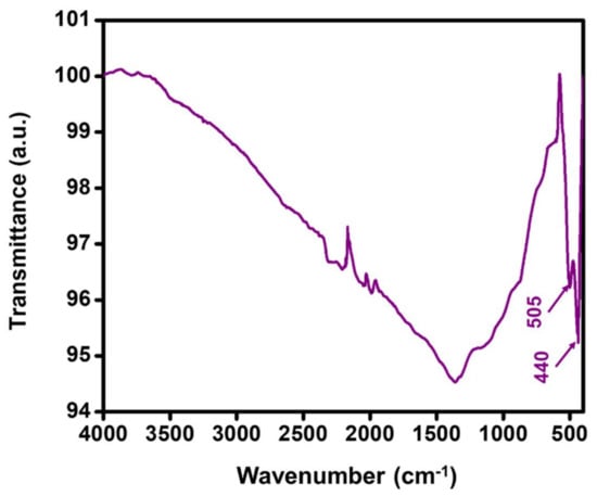 The FT-IR spectroscopic analysis of synthesized ZnO nanocrystals was carried out in the frequency range of 400–4000 cm−1 and the obtained transmittance spectrum is presented in Figure 3. Chemical bonding present in the several organic functional groups and oxides of metals were resonated at different frequencies in the FT-IR spectroscopic analysis. The infrared spectrum of spherical ZnO nanocrystals usually give rise to a peak at 464 cm−1. Conversely, a peak splitting would happen if the shape was anything other than spherical, such as cylindrical or needle-like []. A similar pattern was observed with the synthesized ZnO nanocrystals, exhibiting two characteristic stretching vibrations at 440 and 505 cm−1. A less intense broad peak formed between 750 and 1025 cm−1 corresponding to the bending and twisting vibrations of Zn(OH)2 []. However, the pure ZnO diffraction pattern was obtained from XRD, which confirmed the presence of Zn(OH)2 impurity in an insignificant ratio. In addition, another broad peak was obtained at 1250–1550 cm−1 due to the bending vibrations of the hydroxyl group, possibly from the absorbed moisture content.