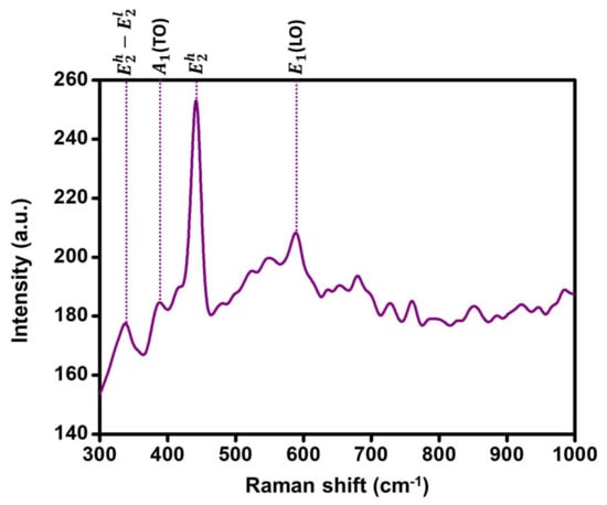 Among the different modes represented in Equation (2), only A1, E1 and E2 modes are Raman-active, whereas the B1 modes are Raman-silent. The prominent peak at 440 cm−1 was assigned to modes, which are non-polar Raman-active modes produced mostly by oxygen atoms []. The stronger E2 modes and weaker E1 modes indicate the lower oxygen deficiency in the sample, which in turn proves the good crystal quality []. Some other obscure peaks were also noticed in the Raman spectrum of synthesized ZnO nanocrystals at 336, 389 and 589 cm−1 assigned to , (TO) and (LO) modes, where (TO) and (LO) are polar modes [].