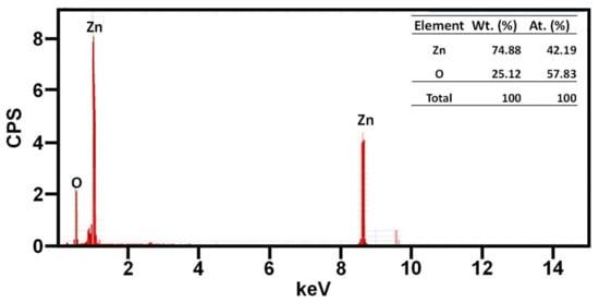 The elemental composition of the prepared ZnO nanocrystals was estimated using EDX spectroscopy, and the obtained percentage data are shown in Figure 6. It disclosed that the synthesized heterostructure contained the required elemental composition. Furthermore, the EDX spectra of ZnO nanocrystals revealed that all the predicted elements, such as Zn and O, exist, and the percentage of elemental compositions is shown in the inset table in Figure 6, which is consistent with the desired ZnO.