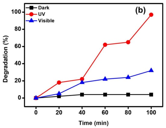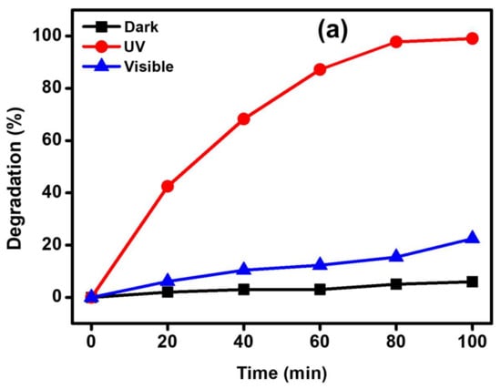 The photocatalytic decomposition of MB dye in the presence of synthesized ZnO nanocrystals, i.e., 5 ppm MB/MY and 15 mg ZnO, was performed in three different environments, i.e., dark, UV light irradiation and natural solar irradiation. The obtained data are presented in Figure 7. When the degradation experiment was conducted in the dark, the photodegradation of the MB was insignificant. In case of the experiments carried out under visible light irradiation and UV irradiation, the photodecomposition of MB was much higher with UV irradiation. The UV-Vis spectrum of the synthesized ZnO nanocrystals supported the results obtained for the degradation of MB under UV irradiation. In a span of 100 min, ~99% degradation was observed under UV irradiation, whereas 97% degradation of MY was observed. For the corresponding counterpart, i.e., visible light, it brought only ~22% of degradation.