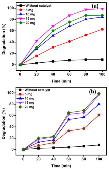 Impact of photocatalyst dose on (a) MB and (b) MY photodegradation employing the as-synthesized ZnO photocatalyst.