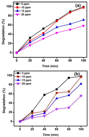 The impact of initial dye concentrations on the decomposition performance of the MB/MY was also assessed by varying the concentration of MB/MY from 5 to 20 ppm under UV irradiation, while maintaining the photocatalyst dose at 15 mg. The attained photocatalytic data are graphically presented in Figure 9a,b. The obtained results disclosed that the photocatalytic performance of the ZnO nanoparticle is inversely proportional to the dye concentration at similar conditions, i.e., maximum degradation efficacy was observed at the lowest MB/MY concentration (5 ppm). By raising the MB concentration from 5 to 20 ppm, the degradation of MB gradually declined from ~99% to ~58% and the degradation of MY was reduced from 97% to 56%. This abatement is owing to the decreased absorption of light on the photocatalyst surface by raising the dye concentration, which in turn reduces the production of OH• radical ions which play a vital role in the photodegradation process. Therefore, it is indispensable to keep the ratio of concentration of photocatalysts to dyes alike. Hence, from the obtained results, it can be concluded that the highest degradation performance of the catalyst can be achieved when the MB dye concentration is 5 ppm, while an almost similar degradation was also obtained for the MB dye concentration at 10 ppm. Therefore, it can be said that the photocatalyst can be optimally used for MB and MY dye degradation in the concentration range between 5 and 10 ppm.