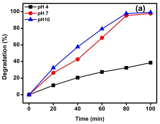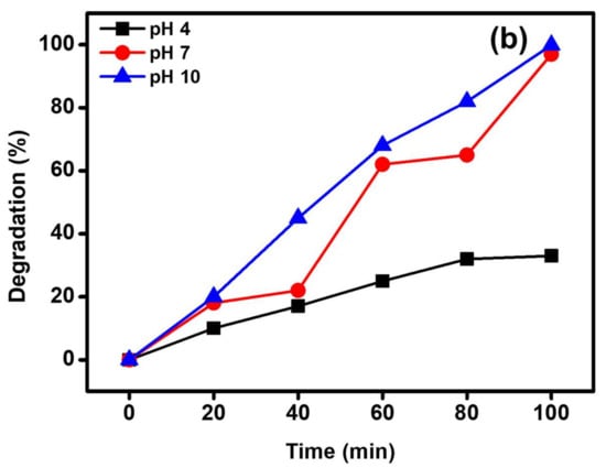 It is well-known that the pH of the solution is one of the most significant parameters in the photocatalytic degradation of organic dyes. This effect is attributed to the change in surface charge of the photocatalyst, which in turn had a considerable effect on the photocatalytic efficacy. Usually, the photocatalytic performance of the photocatalyst is directly related to the availability of OH• radicals in the reaction medium, which improves the photocatalytic decomposition of MB dye by many folds in alkaline aqueous solution. Figure 10 displays the impact of pH value on the photodegradation of MB dye in the presence of the synthesized ZnO photocatalyst. The impact of pH value on the removal of MB/MY was examined at three different pH values of 4, 7 and 10. The results illustrated that by raising the pH value to 10, higher photodegradation was achieved. At an acidic pH value (i.e., pH 4), the lowest degradation performance was obtained, with ~38% degradation of MB and ~33% degradation of MY. As expected, when the pH of the solution is increased, the ZnO photocatalyst showed maximum degradation activity, and approximately 99% degradation of MB was achieved at pH 10. This is possibly because the higher pH value leads to the formation of negative charges on the surface. Since MB is a cationic dye that possesses a positive charge and the dyes are adsorbed on the surface, which possess higher amounts of OH• radical ions, hence the MB undergoes removal by a dual phenomenon, i.e., adsorption/photodegradation, that leads to better removal of MB from the system. However, in the case of MY, an anionic dye, the enhanced degradation at higher pH can be attributed to higher amounts of OH• radical ions generated by the photocatalyst, due to which the photodegradation process is performed more efficiently at higher pH values [,].