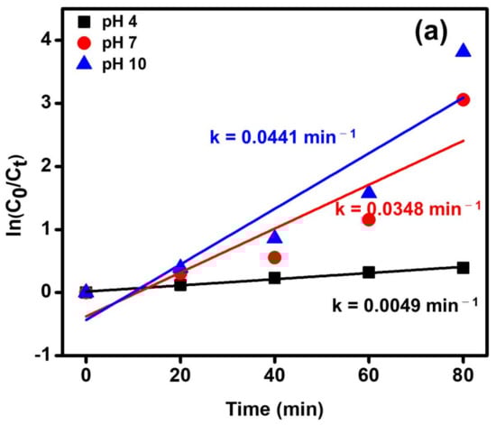 Figure 11a,b illustrates the photocatalytic decomposition of MB and MY dyes using the ZnO photocatalyst for various pH values at optimum reaction circumstances, followed by a pseudo-first-order reaction kinetics, which is given by Equation (3) as: