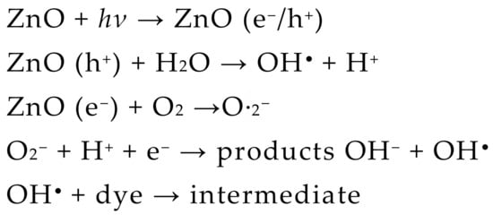 The possible reaction mechanism of ZnO is shown in Figure 11a. When the photons are illuminated on the surface of the nanocrystals, the valance band (VB) electrons become excited and travel to the conduction band (CB). In this way, the formed conduction band electrons and valance band holes initiate the reduction and oxidation reactions, respectively. The superoxide radicals produced by the reduction reaction combine with hydroxyl radicals and generate the H2O2, which further produces the OH• radicals. The produced hydroxyl radicals can degrade the dye molecule.