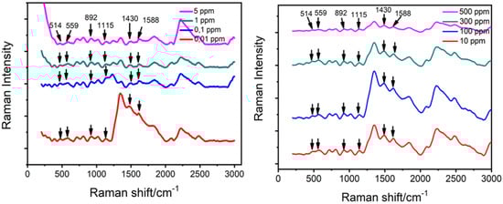 - Davies, R.A.; Chong, N.S.; Ooi, B.G. Chemical enhancement of the surface enhanced Raman scattering signals of anilines via their Ortho-substituents. Opt. Photonics J. 2013, 3, 13–23. [Google Scholar] [CrossRef]