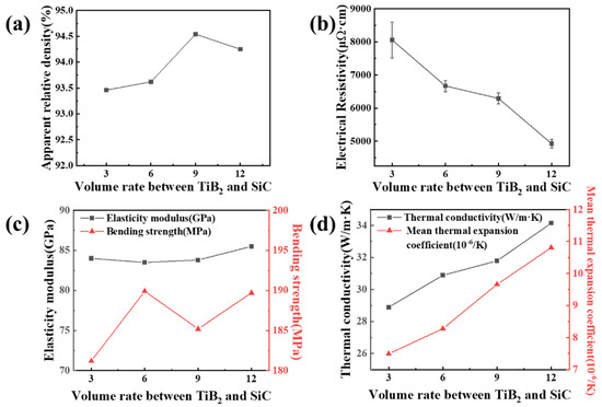 Properties of TiB2-BN-SiC composite ceramics with various volume ratios of TiB2-SiC: (a) the apparent relative density, (b) electrical resistivity, (c) elastic modulus and bending strength, and (d) thermal conductivity and mean thermal expansion coefficient.