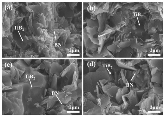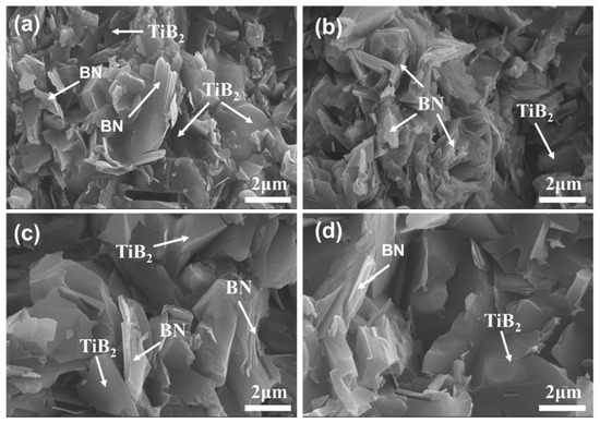 Figure 8 shows that the large grains in the figure are TiB2 and SiC, and the flaky structure grains are BN. With increasing sintering temperature, the grains of the flaky BN ceramics grow significantly, the TiB2 and SiC grains are dispersed around the BN, the two are more closely combined, and the voids are reduced. This is because at 1650 °C, the sintering temperature is low, the growth of BN grains is not complete, and the density is not high. Above 1750 °C, the densification process of BN grains is basically completed under the effect of B2O3 sintering. With a further increase in the sintering temperature, TiB2, SiC, and BN grains grow more completely; hence, the apparent relative density increases. The growth of the grains of the lamellar BN causes more transgranular fractures of the lamellar structure at the ceramic fracture; thus, the bending strength of the sample increases, which is consistent with the result of Figure 6c.