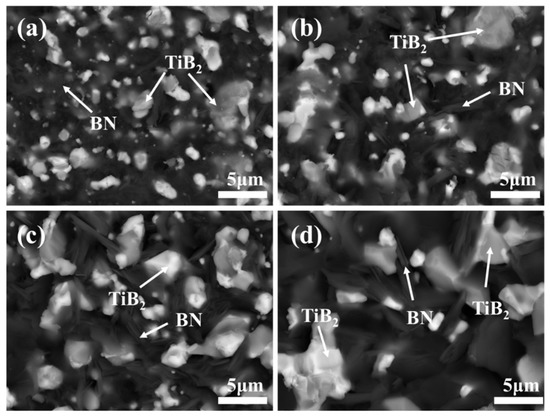Figure 5 shows surface backscattering photos of TiB2-BN-SiC composite ceramics with four volume ratios. The grey–white areas in the picture are TiB2 particles, and the black areas are the BN matrix. As shown in the figure, as the content of TiB2 increases, the grain size of TiB2 in the ceramic matrix increases significantly. From Figure 5a–d the grain size increases from 2.61 to 5.08 μm. This is because as the content of TiB2 increases, the possibility of TiB2 particles contacting each other is higher, which facilitates bonding during the sintering process, thereby promoting grain growth. According to the figure, as the ratio increases, the number of fine particles on the surface gradually decreases, thereby indicating that the crystallinity is better, which is also evidenced by the finer phase diffraction peaks.