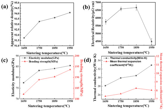 - The increase in the sintering temperature of the multiphase ceramics promotes the relative density and mechanical properties of the ceramics. The electrical resistance initially increases and subsequently decreases at 1950 °C. The thermal conductivity and thermal expansion also gradually increase.