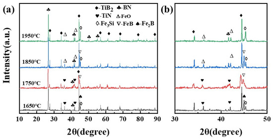 Figure 7 shows that the diffraction peaks that correspond to TiB2 and BN are detected in the samples that are fired at four temperatures, and the peak intensities of the two phases are more consistent among the temperatures. The peak width that corresponds to BN gradually narrows with increasing sintering temperature, thereby indicating that the BN powder has higher crystallization performance with increasing temperature and the corresponding BN matrix is purer. Various impurity peaks, such as FeO, Fe3Si, and FeB peaks, are also detected in the 35–50° interval. As the temperature increases, the diffraction peaks of FeB and Fe2B, among others, gradually disappear and are replaced by increasingly enhanced Fe3Si peaks. This may be due to the increase in temperature accelerating the formation of the liquid phase, in which some of the Si atoms enter the Fe atoms to form Fe3Si intermetallic compounds. Fe3Si has excellent electrical properties [29]. Therefore, the sudden drop in resistivity of the composite ceramic at 1950 °C may be because the contents of FeO and Fe3Si, which are conductive materials, in the sample have reached the threshold of percolation theory.