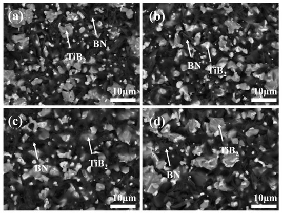 Figure 9 shows backscattered images of TiB2-BN-SiC composite ceramics with four sintering temperatures. As the sintering temperature increases, the size of the white particles in the image gradually increases, and abnormal crystal grains are observed at 1950 °C. The particle size reaches from 5 μm in Figure 9a to 10 μm in Figure 9d, which is caused by overburning at sintering temperatures that are too high. As the content of each component is the same, it is found that the sintering temperature has little effect on the phase distribution of TiB2-BN-SiC composite ceramics.