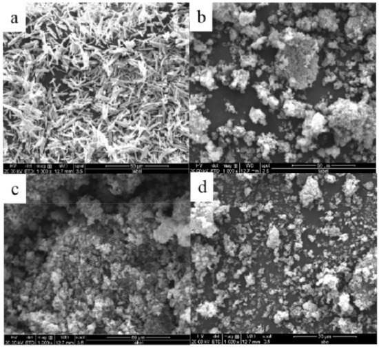 Figure 2 display the XRD pattern of ZnO and PANI composites with different amounts of ZnO. The characteristic peaks of ZnO were observed at 2θ = 31.77°, 34.42°, 36.25°, 47.53°, 56.60°, 62.86°, 66.38°, 67.96° and 69.10°, which corresponded to the planes such as (100), (002), (101), (102), (110), (103), (200), (112) and (201), respectively, and no other peak was determined. The sharp characteristic peaks, in agreement with the hexagonal wurtzite crystal structure of ZnO (JCPDS:36-1451) [27], revealed the good crystallinity of ZnO. The two broad peaks of PANI and PANI composites was observed at 2θ = 20° and 25°, which were attributed to the periodicity in the direction perpendicular and parallel to the polymer chain, respectively. With the increase of the amount of ZnO, the main peaks of ZnO were not clear in Figure 2c,d, which was probably caused by PANI encapsulated rod-like ZnO. Therefore, the FTIR spectra of ZnO, PANI and PANI/ZnO composites was collected and shown in Figure S1 (in Supplementary Materials), which indicated ZnO existed in the PANI/ZnO composites through comparative analysis.