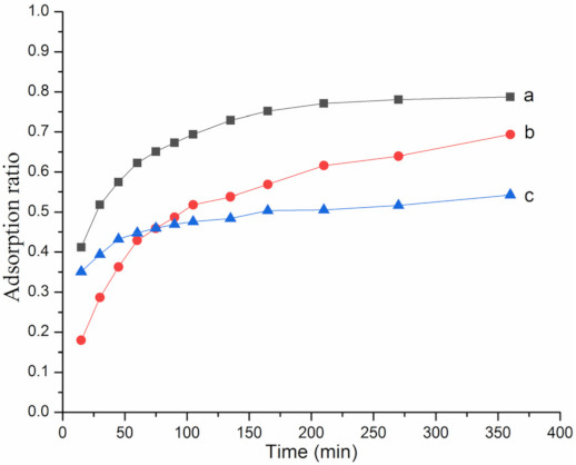 Adsorption Ratio of MO adsorbed by PANI composites with different amounts of ZnO, (a) 0%; (b) 8% and (c) 15%.