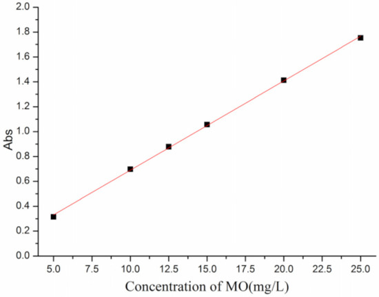 A series of MO solutions with different concentrations were prepared, and the absorbance of the peak at 464 nm was collected through a Uv-visspectrophotometer. The linear fitting between the concentration of MO and the absorbance is shown in Figure 5, and the slope and the correlation coefficient R2 were 0.07178 and 0.99936, respectively.