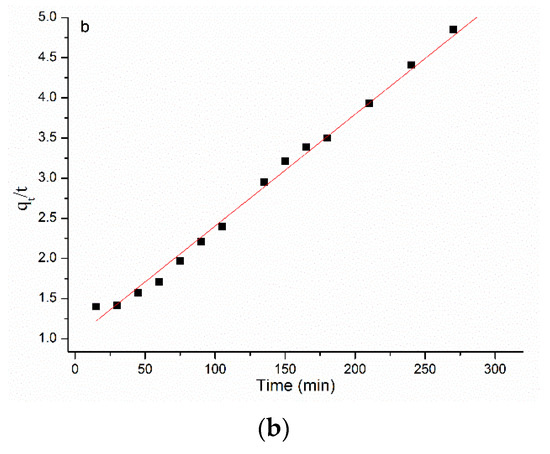 In combination with the linear fitting obtained in Figure 5, the adsorption equilibrium capacity (qe) and adsorption capacity (qt) of PANI/ZnO was calculated, according to the below Equations (1) and (2). Then the quasi-first-order kinetic equation and quasi-second-order kinetic equation of the adsorption process were calculatedaccording to the below Equations (3) and (4), and the obtained plot is displayed in Figure 6. The correlation coefficients obtained through linear fitting were 0.98294 and 0.99585, respectively, which indicated the adsorption process of MO adsorbed by PANI/ZnO adsorbent agreed with the quasi-second-order kinetic equation.