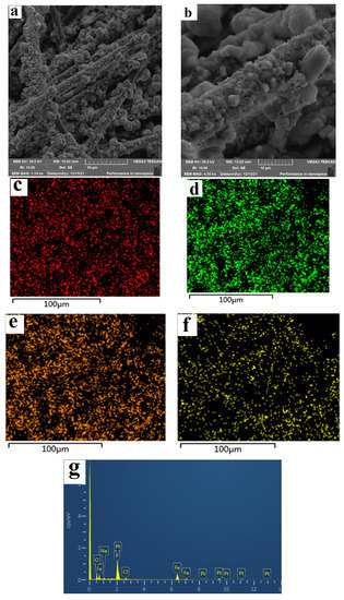 SEM images (a,b), edx mapping (c–f) and EDX spectrum (g) of FeP-Pt/CC.