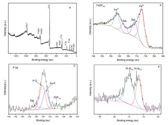 XPS spectra of FeP-Pt/CC (a) survey spectrum, (b) Fe 2p, (c) P 2p and (d) Pt 4f.